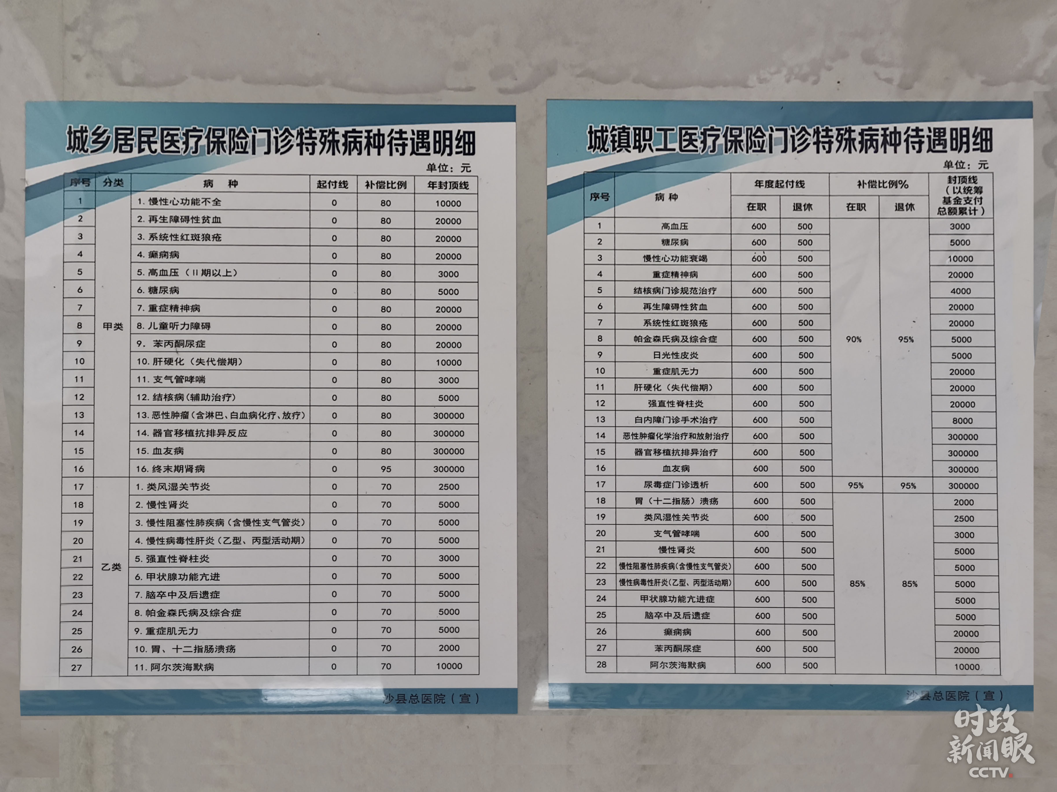△這是當(dāng)?shù)爻青l(xiāng)居民(左)和城鎮(zhèn)職工(右)醫(yī)療保險(xiǎn)門診特殊病種待遇明細(xì)。(總臺(tái)央視記者楊立峰拍攝)