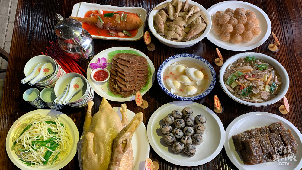 在俞邦村,習(xí)近平考察了夏茂特色小吃民俗文化館。館中最吸引眼球的當(dāng)屬這桌豐盛的壽宴。按照當(dāng)?shù)亓?xí)俗,壽宴當(dāng)天,大公雞、壽餅、壽酒、壽桃、壽面、壽燭、壽炮都是必備之禮。