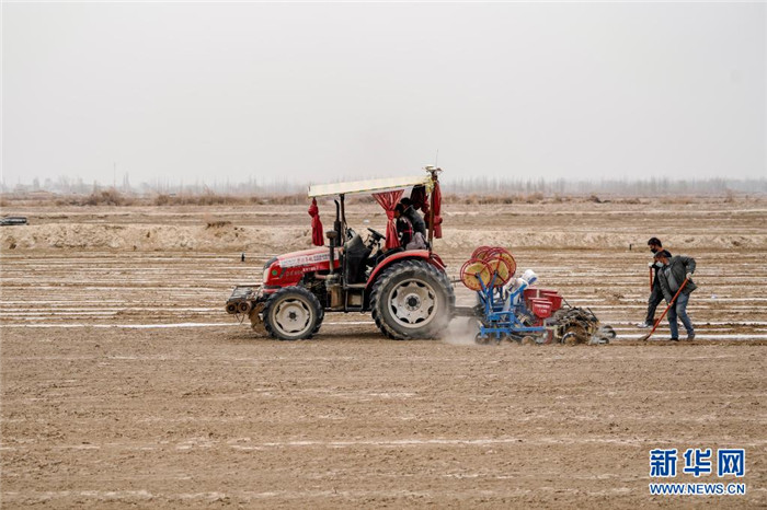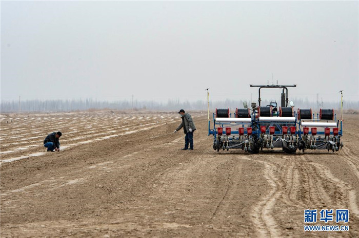 在位于新疆喀什地區(qū)莎車(chē)縣的棉田里,農(nóng)民在播種棉籽(3月26日攝)。新華社記者 馬鍇 攝