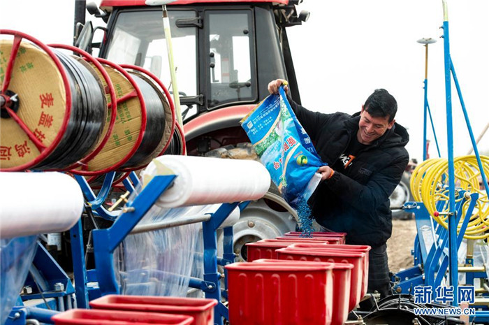 在新疆喀什地區(qū)莎車(chē)縣,阿卜杜薩力·阿伍提往播種機(jī)里倒棉籽(3月26日攝)。新華社記者 馬鍇 攝