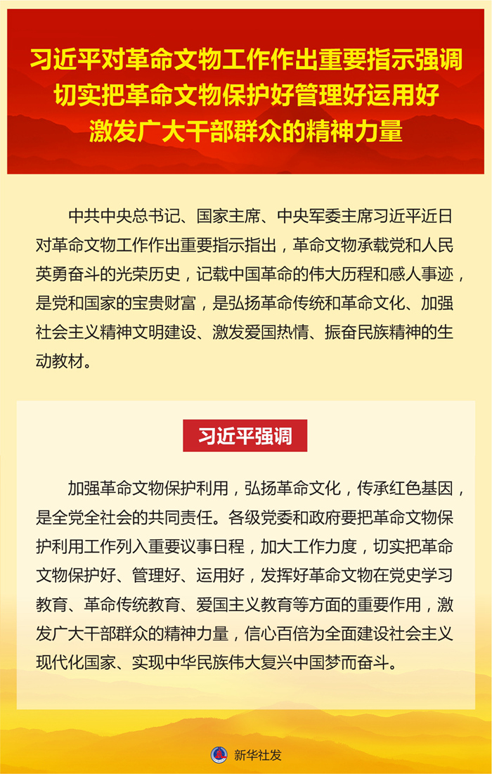 習(xí)近平強(qiáng)調(diào),加強(qiáng)革命文物保護(hù)利用,弘揚(yáng)革命文化,傳承紅色基因,是全黨全社會(huì)的共同責(zé)任。各級(jí)黨委和政府要把革命文物保護(hù)利用工作列入重要議事日程,加大工作力度,切實(shí)把革命文物保護(hù)好、管理好、運(yùn)用好,發(fā)揮好革命文物在黨史學(xué)習(xí)教育、革命傳統(tǒng)教育、愛國(guó)主義教育等方面的重要作用,激發(fā)廣大干部群眾的精神力量,信心百倍為全面建設(shè)社會(huì)主義現(xiàn)代化國(guó)家、實(shí)現(xiàn)中華民族偉大復(fù)興中國(guó)夢(mèng)而奮斗。