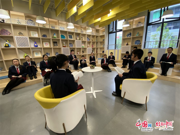 隨后,媒體代表們參觀了學校思維碰撞、巖彩壁畫、未來校園、牛仔花園等特色展區(qū)。在學校朗讀角,七年級的張語桐手捧一本《失群之鳥》詩集,看得入迷。她喜歡看科幻小說和人物傳記,開放的讀書角就成了她和小伙伴常來的地方,位于教室另一個側(cè)的“思維碰撞”讀書分享區(qū),也隨時可以跟同學們交流讀書心得。
