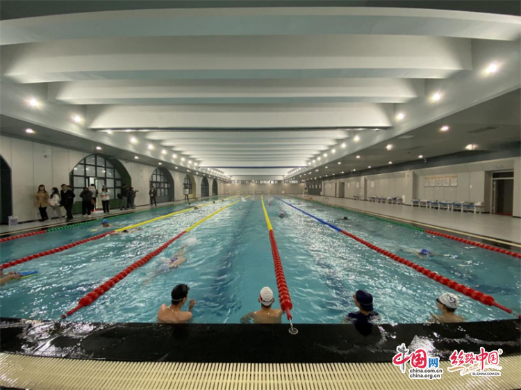 在學校室內(nèi)游泳館,該校體育老師介紹,泳池是標準的五條道50米長池,采用智能水循環(huán)系統(tǒng),定時加溫、消毒,保證水質(zhì)干凈。學校還有按國家標準建設的籃球場,田徑場,各項體育設施非常先進。