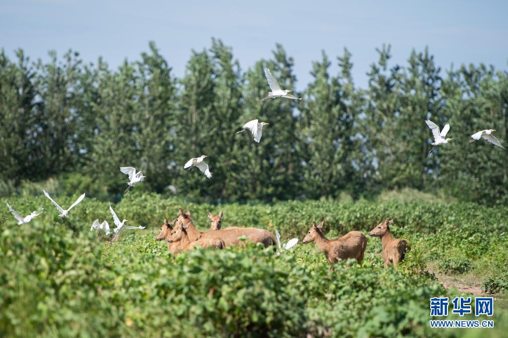 這是在湖南岳陽東洞庭湖麋鹿和鳥類救治避難中心拍攝的麋鹿和飛鳥(2020年8月7日攝)。新華社記者 陳思汗 攝