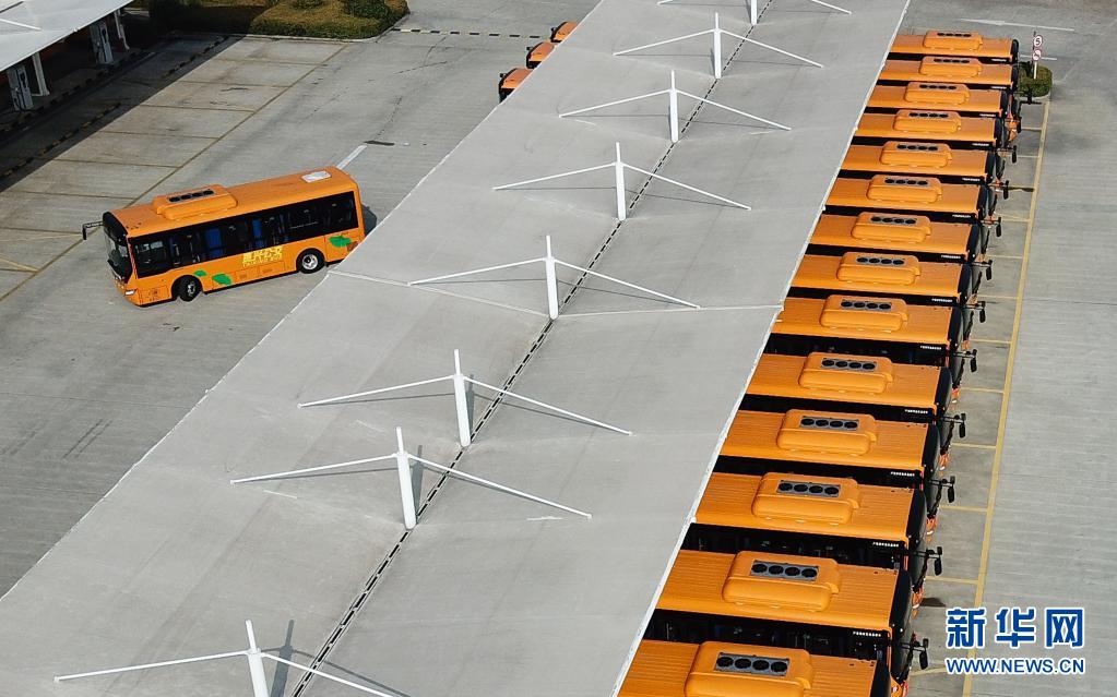 在江蘇省泰興市公交總站,一輛純電動公交車入站充電(2018年11月10日攝,無人機(jī)照片)。新華社記者 季春鵬 攝