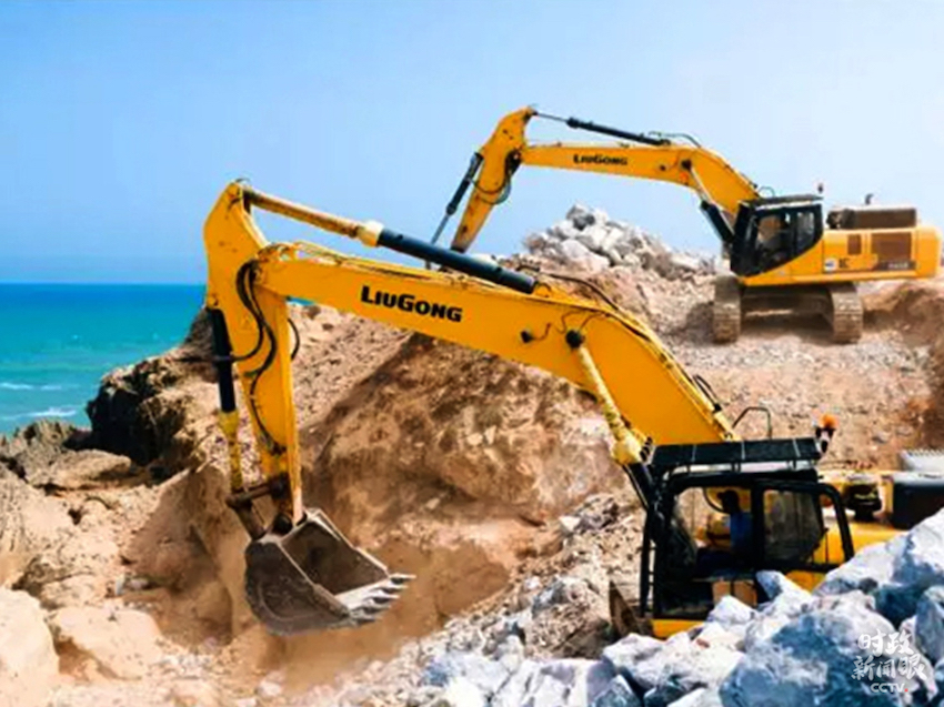△2017年,摩洛哥首都拉巴特,大西洋海岸施工現(xiàn)場,柳工挖掘機進行大塊石料的堆積作業(yè)。(資料圖)