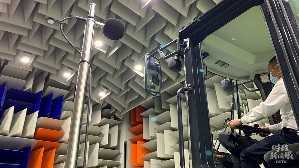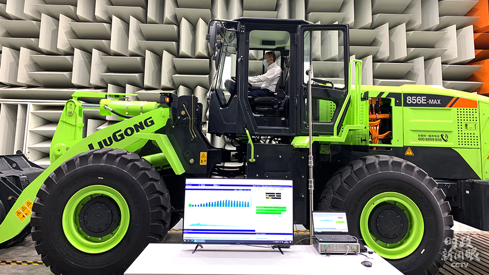 △研發(fā)中心的半消聲實驗室正在為一款純電動裝載機檢測噪聲數(shù)據(jù)。(總臺央視記者程鋮、張曉鵬拍攝)