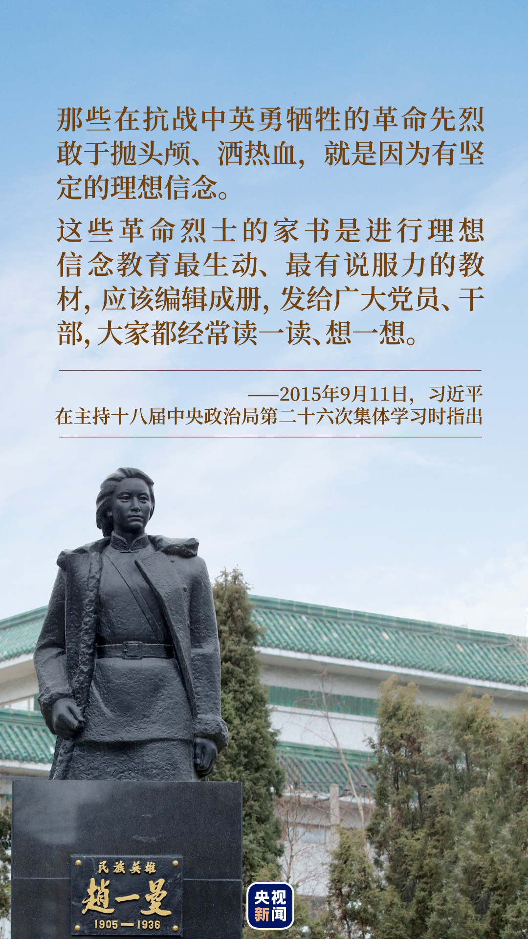“趙一曼在臨死前的遺書中寫道:‘母親因?yàn)閳?jiān)決地做了反滿抗日的斗爭,今天已經(jīng)到了犧牲的前夕了。母親和你在生前是永久沒有再見的機(jī)會了……我最親愛的孩子啊!母親不用千言萬語來教育你,就用實(shí)行來教育你。在你長大成人之后,希望你不要忘記你的母親是為國而犧牲的……母親死后,我的孩子要代替母親繼續(xù)斗爭,自己壯大成長,來安慰九泉之下的母親!’”一字一句,總書記飽含深情。