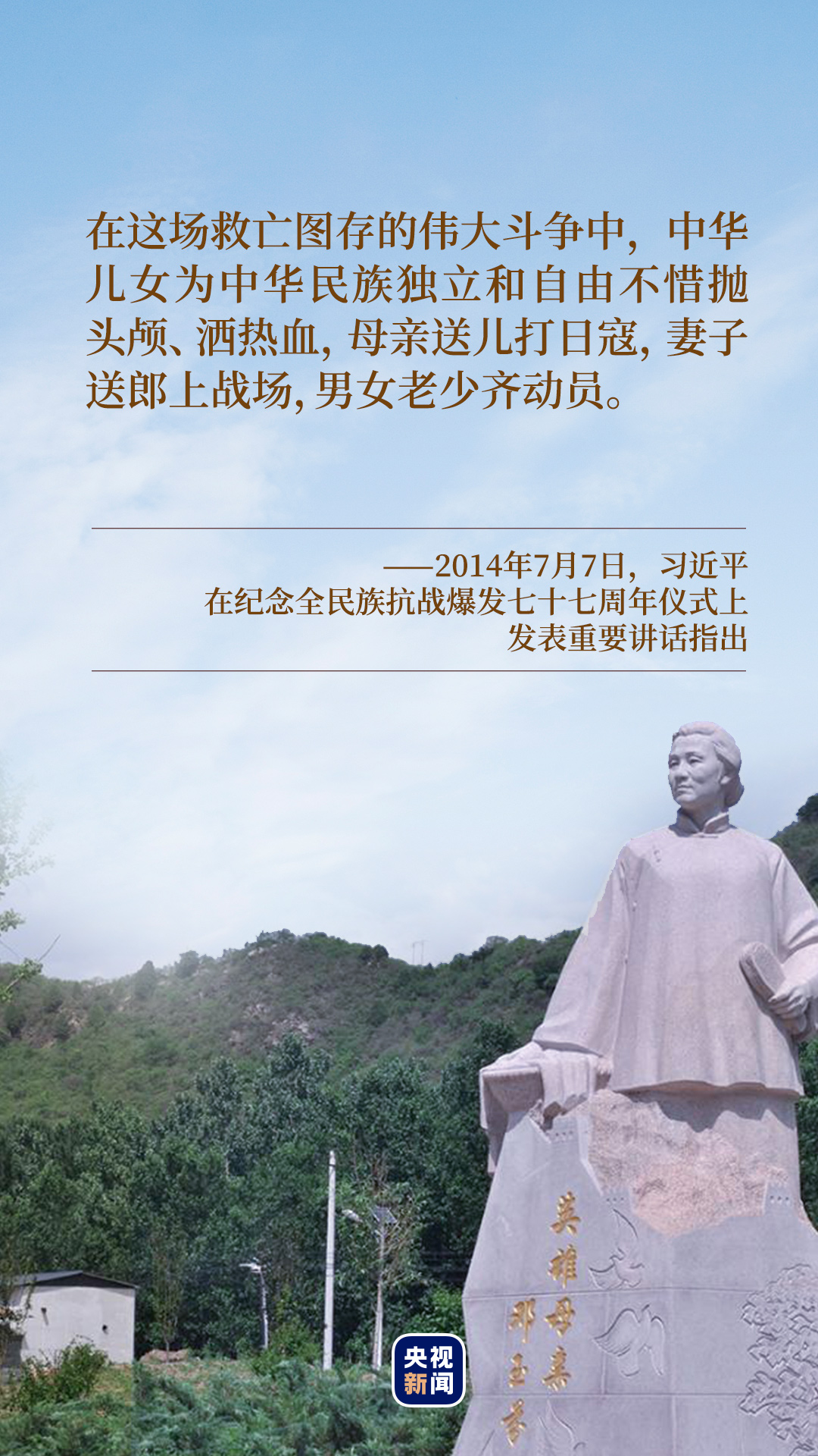 “北京密云縣一位名叫鄧玉芬的母親,把丈夫和5個孩子送上前線,他們?nèi)繎?zhàn)死沙場。”2014年7月7日,在出席紀(jì)念全民族抗戰(zhàn)爆發(fā)七十七周年儀式并發(fā)表重要講話時,習(xí)近平總書記講述了英雄母親鄧玉芬的故事。