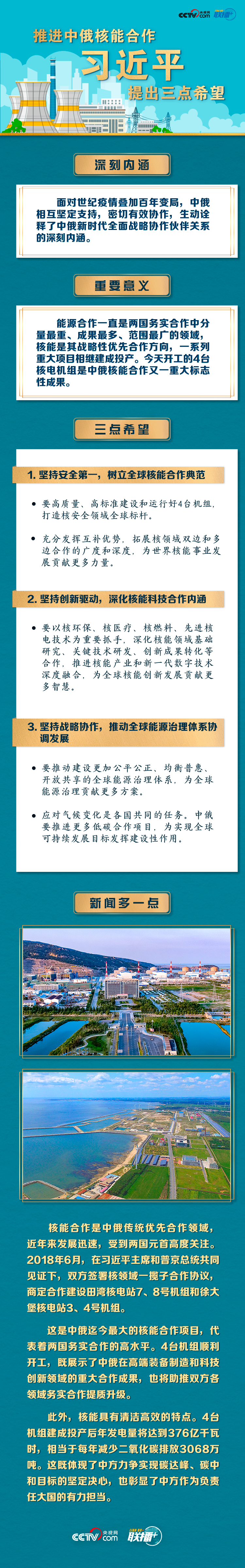 聯(lián)播+“今年是《中俄睦鄰友好合作條約》簽署20周年。我同普京總統(tǒng)商定,將在更高水平、更廣領(lǐng)域、更深層次推進雙邊關(guān)系向前發(fā)展。”5月19日,習近平主席在北京通過視頻連線,同俄羅斯總統(tǒng)普京共同見證兩國核能合作項目——田灣核電站和徐大堡核電站開工儀式。