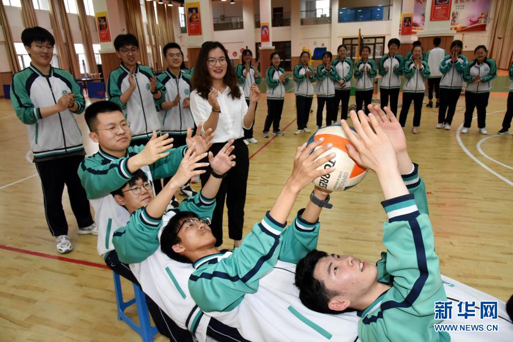 5月23日,青島通濟(jì)實(shí)驗(yàn)學(xué)校高三學(xué)生在進(jìn)行“躺椅傳球”游戲。新華社記者 李紫恒 攝