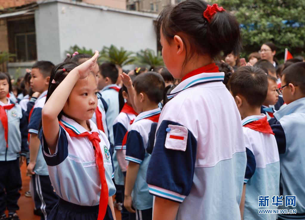 5月31日,南寧市濱湖路小學(xué)的學(xué)生參加入隊儀式。新華社記者 曹祎銘 攝