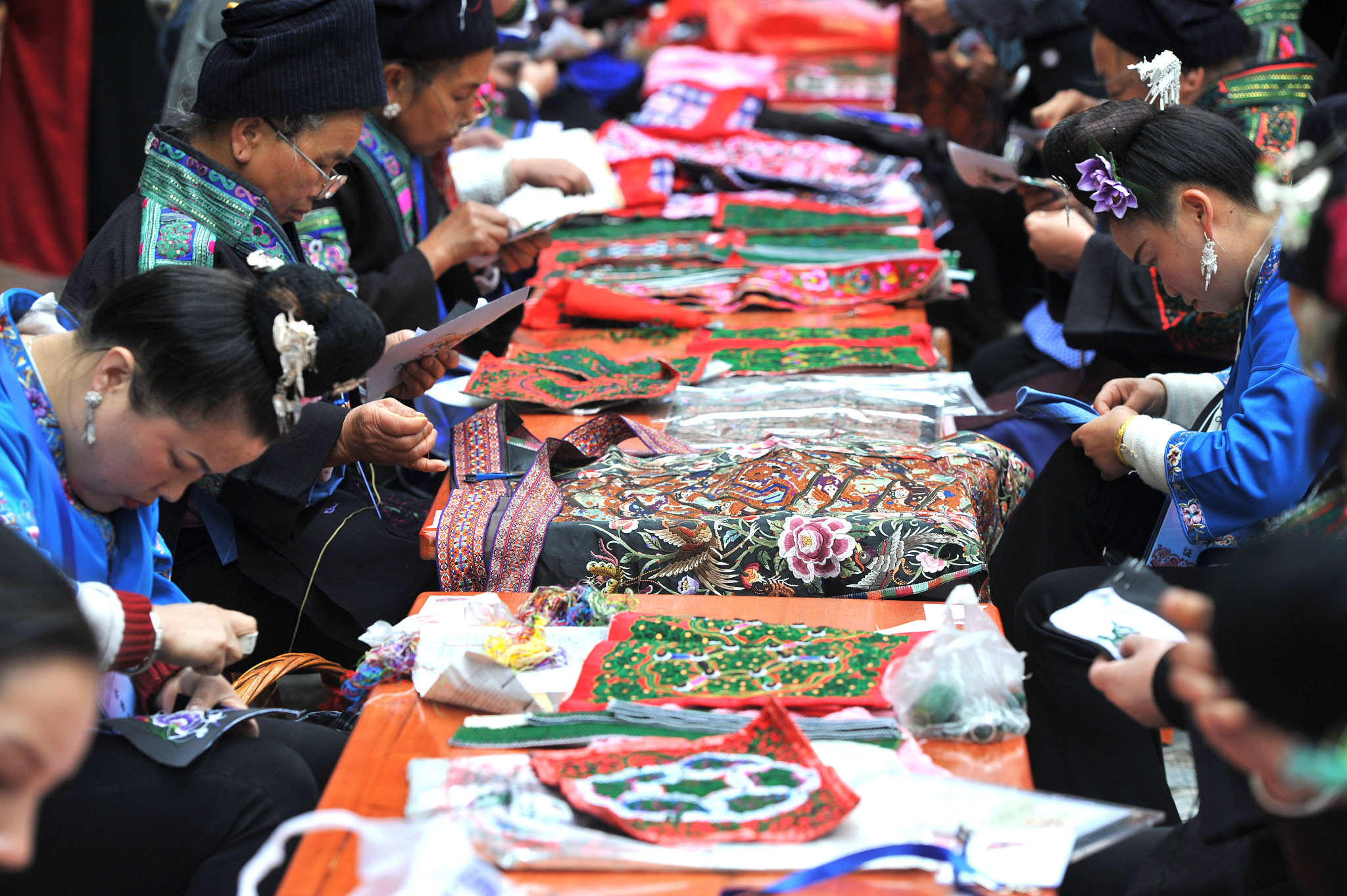 △2021年4月25日,貴州黔東南,200余名繡娘在苗繡技能大賽中飛針走線。(圖/視覺中國(guó))