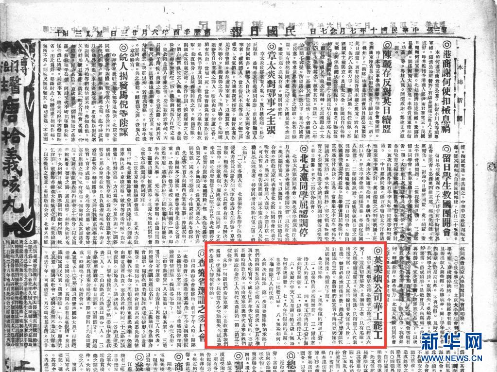 1921年7月27日的《民國日報(bào)》上登載了上海浦東英美煙草公司華工罷工的消息。新華社發(fā)(上海圖書館提供)
