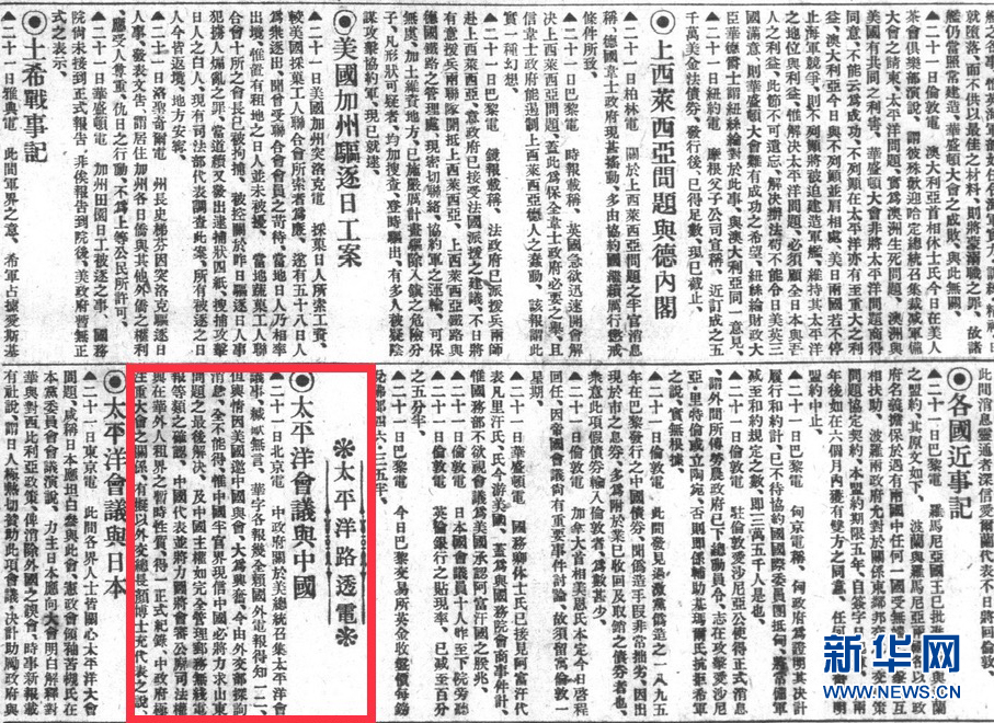 1921年7月23日《申報(bào)》上的消息《太平洋會議與中國》。新華社發(fā)(上海圖書館提供)