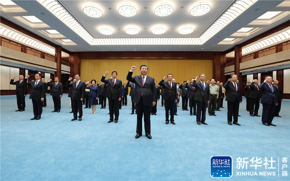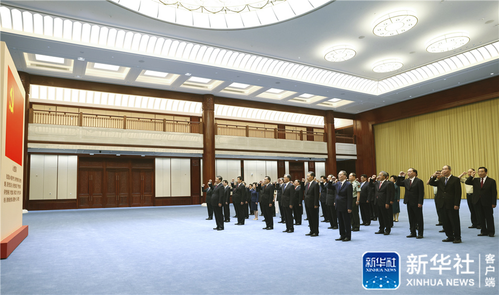 6月18日,黨和國家領導人習近平、李克強、栗戰(zhàn)書、汪洋、王滬寧、趙樂際、韓正、王岐山等在中國共產(chǎn)黨歷史展覽館參觀“‘不忘初心、牢記使命’中國共產(chǎn)黨歷史展覽”。這是參觀結束后,習近平帶領黨員領導同志一起重溫入黨誓詞。新華社記者 李學仁 攝