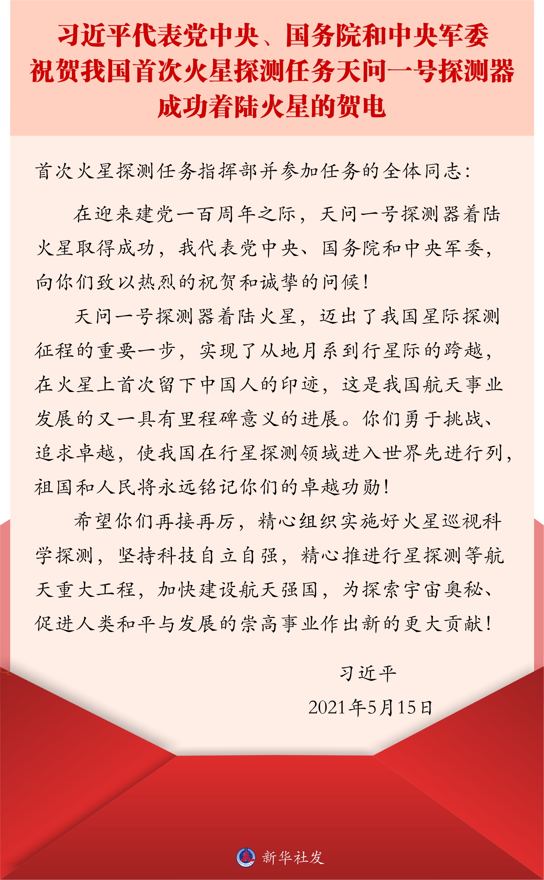 ↑2021年5月15日,習(xí)近平代表黨中央、國(guó)務(wù)院和中央軍委致電祝賀我國(guó)首次火星探測(cè)任務(wù)天問(wèn)一號(hào)探測(cè)器成功著陸火星。