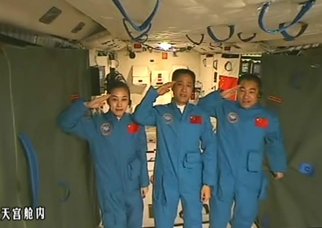 ↑6月17日在北京航天飛行控制中心拍攝的進(jìn)駐天和核心艙的航天員向全國(guó)人民敬禮致意的畫面。