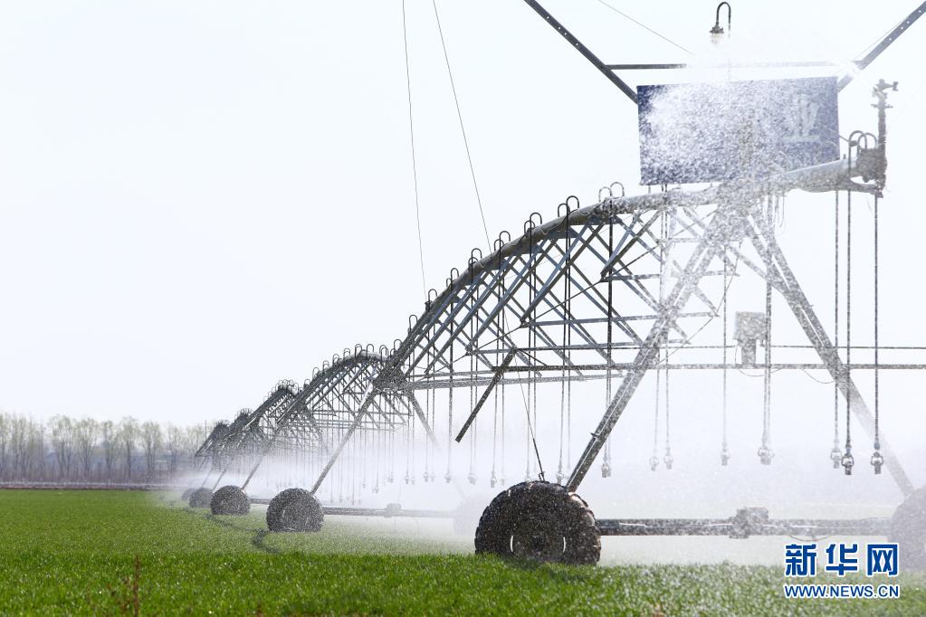 2021年2月23日,在河南省鶴壁市??h一片高標(biāo)準(zhǔn)農(nóng)田里,自走式噴灌機在為小麥澆水。新華社記者 許雅楠 攝