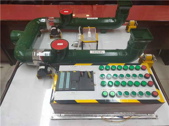 該模型由監(jiān)控系統(tǒng)和風(fēng)機(jī)主體兩部分構(gòu)成,監(jiān)控系統(tǒng)由PLC柜中的S7-300PLC模塊及電腦組成,風(fēng)機(jī)主體利用PVC管材制作的風(fēng)筒以及小電機(jī)組成。不僅可滿足實(shí)操培訓(xùn)教學(xué),同時(shí)還可進(jìn)行模擬故障情況下的倒機(jī)操作,能有效提高主扇司機(jī)的操作技能,為公司礦井通風(fēng)系統(tǒng)的安全穩(wěn)定運(yùn)行多了一層保障。