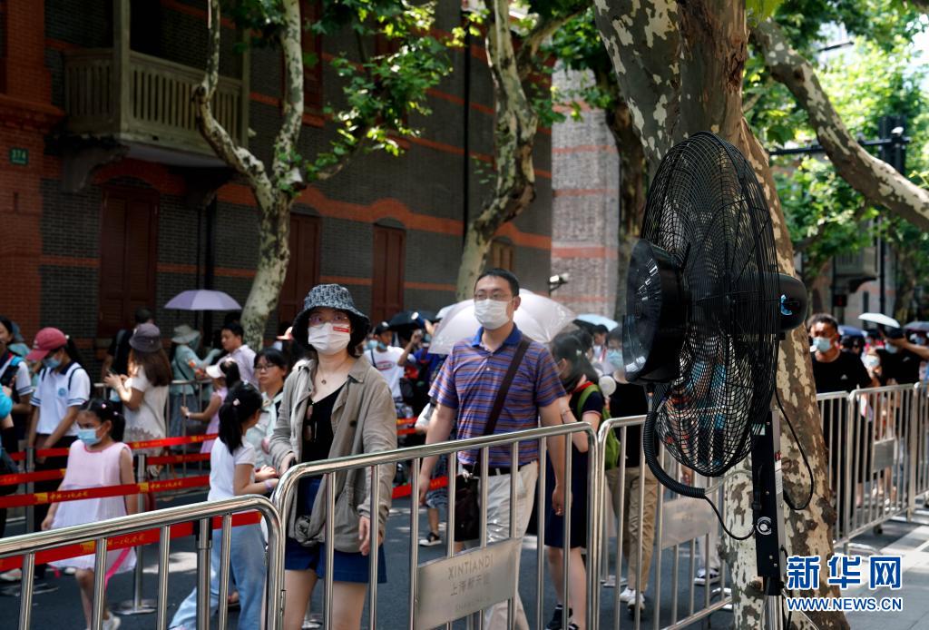 中共一大紀(jì)念館在觀眾排隊通道設(shè)置多個噴霧風(fēng)扇用于降溫(7月11日攝)。新華社記者 劉穎 攝