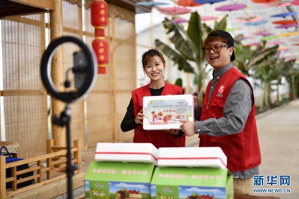 5月11日,工作人員在河北省唐山市豐潤區(qū)西那母生態(tài)旅游度假村內(nèi)通過網(wǎng)絡直播的形式推介草莓。新華社記者 牟宇 攝