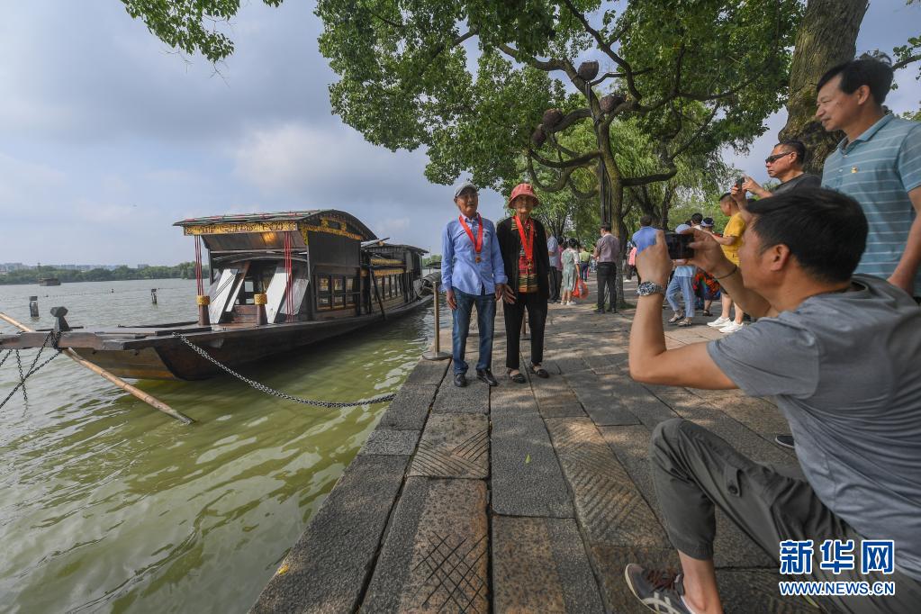 7月1日,兩名老黨員在浙江嘉興南湖湖心島停泊的南湖紅船旁拍照留影。新華社記者 徐昱 攝