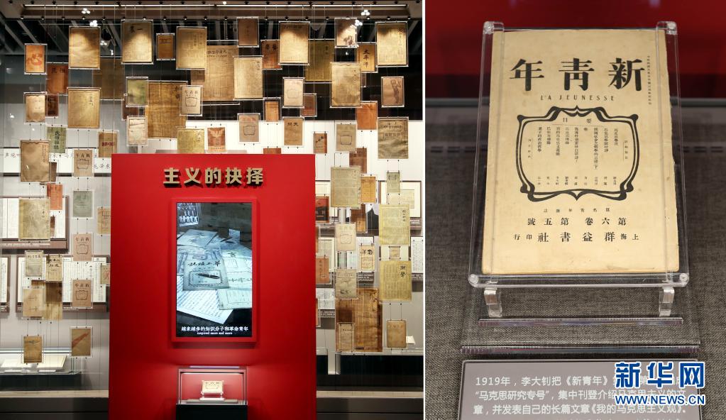 這是6月1日在上海的中共一大紀(jì)念館拍攝的大型立體式視覺置景“主義的抉擇”,100件五四運(yùn)動前后傳播馬克思主義、社會主義的報紙雜志,錯落陳列在玻璃墻上。其中,《新青年》第6卷第5號“馬克思研究專號”在前端“高光”展示,這期“專號”標(biāo)志著馬克思主義在中國的傳播進(jìn)入了較為系統(tǒng)的階段。新華社記者 劉穎 攝