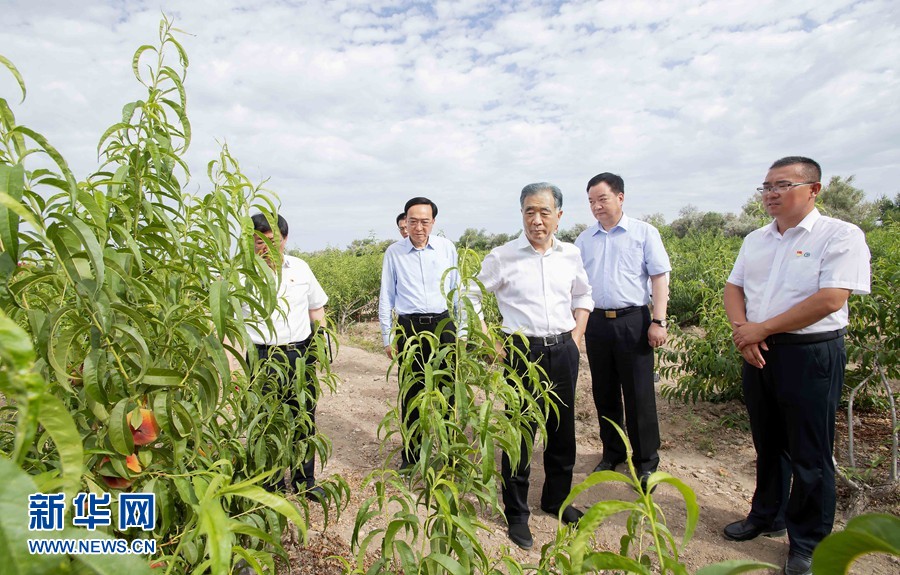 7月21日至24日,中共中央政治局常委、全國(guó)政協(xié)主席汪洋在新疆調(diào)研兵團(tuán)工作。這是23日,汪洋在兵團(tuán)十師北屯市千畝桃園了解果樹長(zhǎng)勢(shì)。新華社記者 李濤 攝