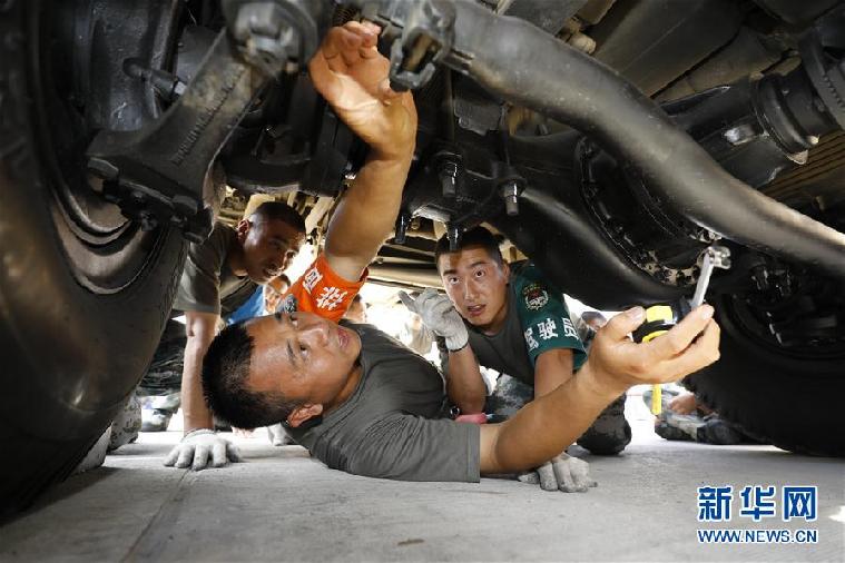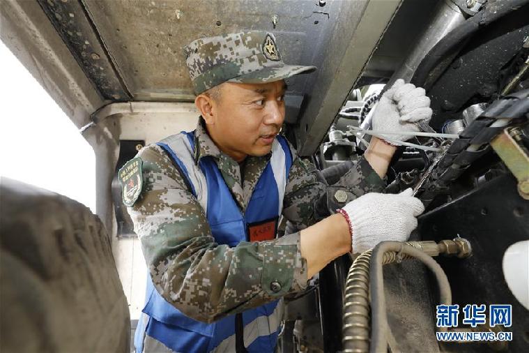 聯(lián)勤保障部隊某團(tuán)修理技師張俊凱在檢修車輛(2019年6月5日攝)。 新華社發(fā)(曾曾 攝)