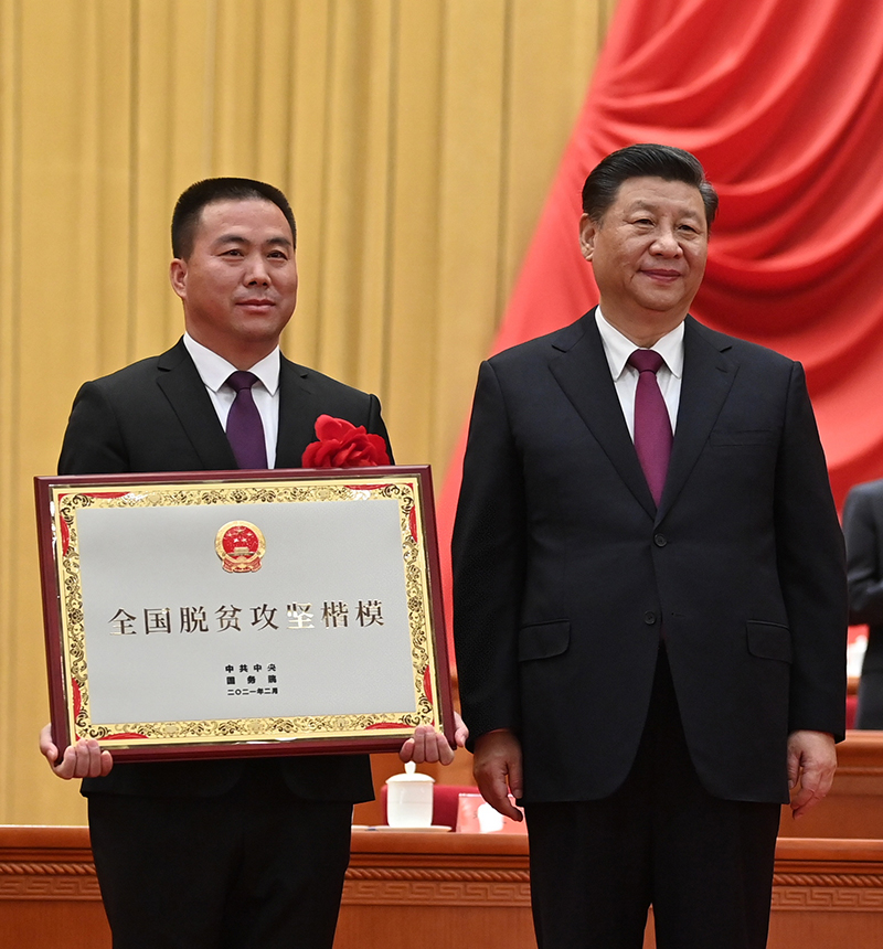 2月25日,全國脫貧攻堅(jiān)總結(jié)表彰大會在北京人民大會堂隆重舉行。這是習(xí)近平為全國脫貧攻堅(jiān)楷模榮譽(yù)稱號獲得者寧夏回族自治區(qū)永寧縣閩寧鎮(zhèn)頒獎 李學(xué)仁攝/本刊