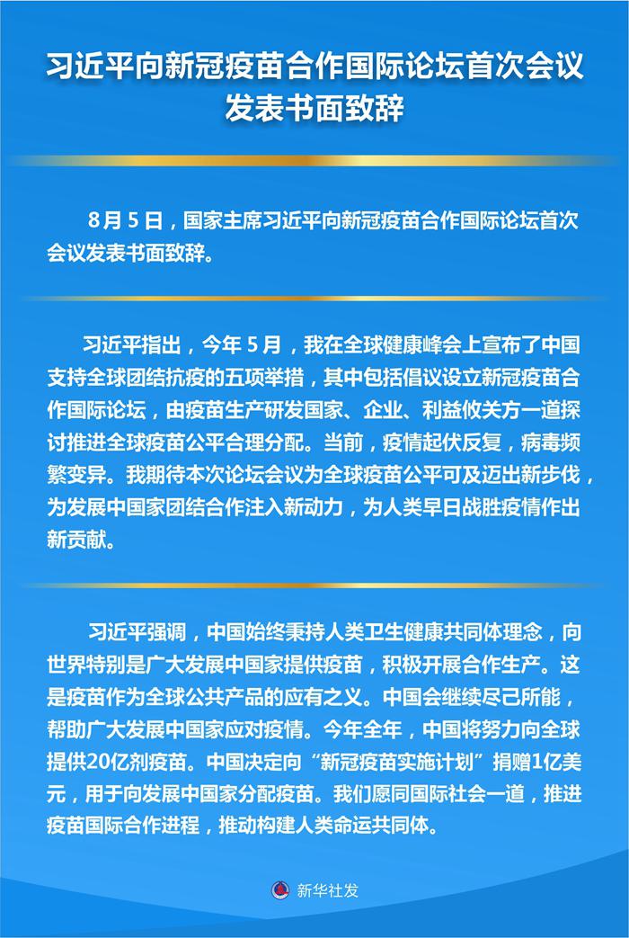“今年5月,我在全球健康峰會上宣布了中國支持全球團結(jié)抗疫的五項舉措,其中包括倡議設(shè)立新冠疫苗合作國際論壇,由疫苗生產(chǎn)研發(fā)國家、企業(yè)、利益攸關(guān)方一道探討推進全球疫苗公平合理分配。”習近平在書面致辭中介紹了本次論壇的由來。