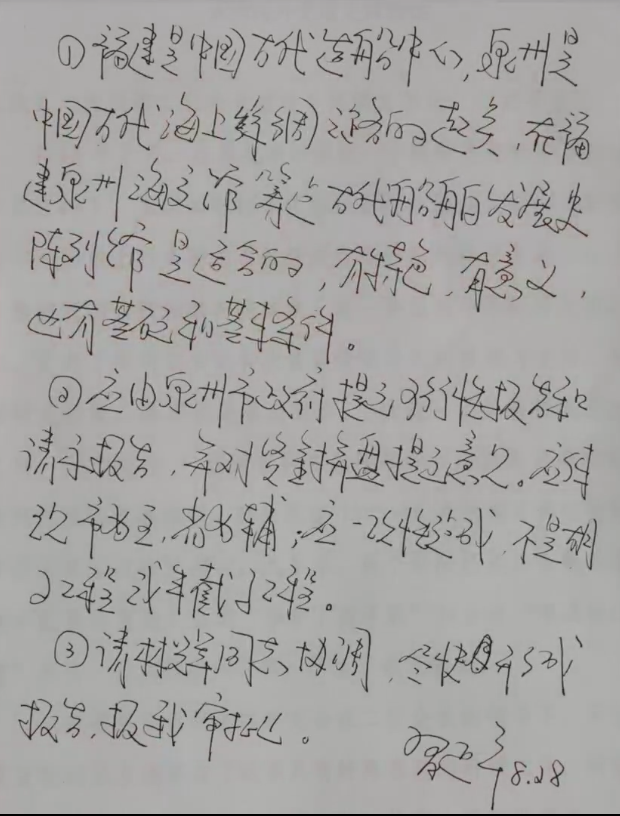 學(xué)習(xí)小組注意到,專題片中出現(xiàn)了一份習(xí)近平的親筆批示。這份20多年前的批示,全文近150字,肯定了福建泉州籌建古代船舶發(fā)展史陳列館的做法。今天的故事,就從這份批示講起。