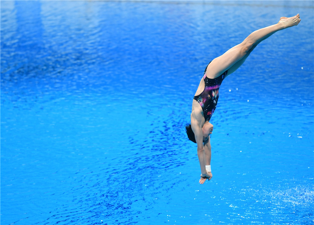 2021年8月5日,全紅嬋在比賽中。當(dāng)日,在東京奧運(yùn)會(huì)跳水項(xiàng)目女子10米跳臺(tái)決賽中,中國選手全紅嬋奪得冠軍。新華社記者 丁旭 攝