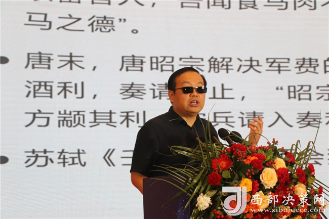 陜西師范大學(xué)歷史文化學(xué)院教授、博士生導(dǎo)師于賡哲教授以《西鳳高飛——講好中國的酒故事》為題作了酒文化分享。他從穆公賜酒、唐代榷酒、蘇軾詠酒、明清燒坊等方面講述了西鳳酒悠久的歷史文化,同時對西鳳酒的發(fā)展提出了思考,他講到白酒行業(yè)的營銷要重視文化底蘊、緊抓年輕一代消費者的品味,號召大家要弘揚好西鳳酒,講好中國酒故事。