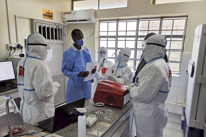 在南蘇丹首都朱巴的一處新冠病毒檢測(cè)機(jī)構(gòu),中國(guó)抗疫醫(yī)療專(zhuān)家組成員與南一線(xiàn)醫(yī)護(hù)人員交流(2020年8月21日攝)。新華社發(fā)(中國(guó)駐南蘇丹大使館供圖)