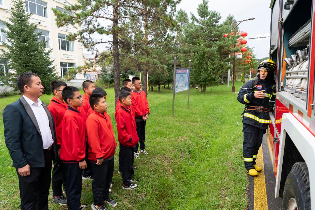 9月6日,在北極鎮(zhèn)中心學(xué)校,馬建國和學(xué)生一起上消防知識“開學(xué)第一課”。新華社記者謝劍飛 攝