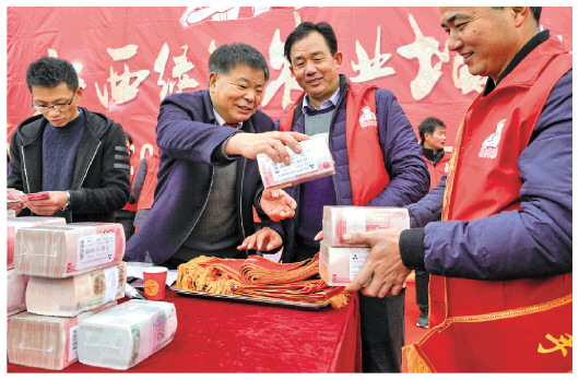 2019年1月18日,安義縣“糧王”凌繼河(右三)給農(nóng)民員工發(fā)放獎金。(新華社資料片)