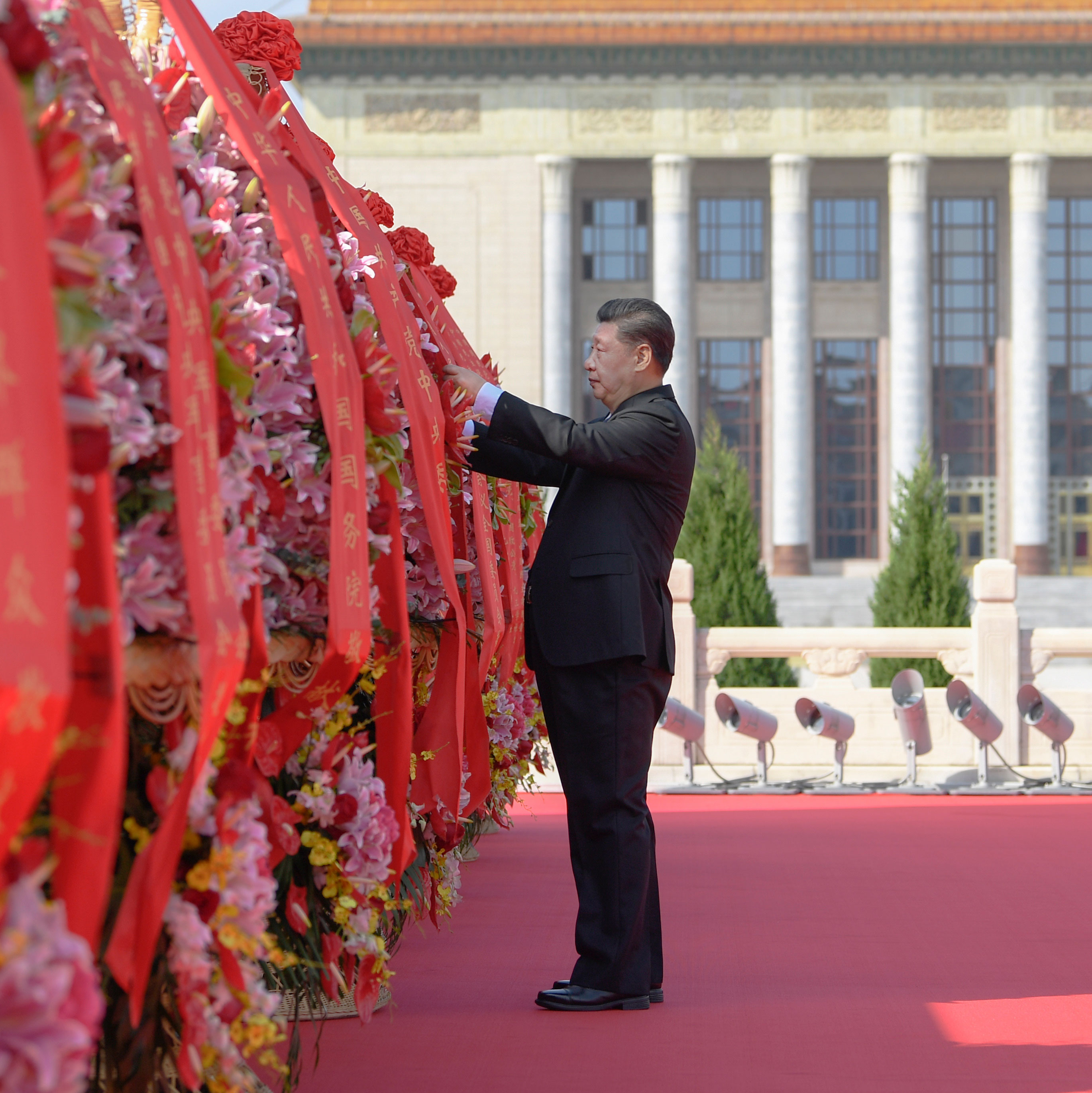 △2020年9月30日上午,習(xí)近平總書記出席烈士紀(jì)念日向人民英雄敬獻(xiàn)花籃儀式。這是習(xí)近平總書記整理花籃上的緞帶。
