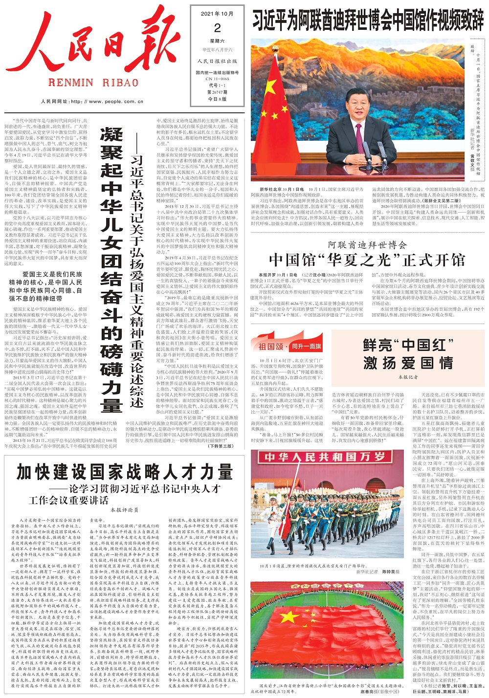 “2019年,最難忘的是隆重慶祝新中國成立70周年。”習近平主席在二〇二〇年新年賀詞中強調(diào),“我們?yōu)楣埠蛧?0年的輝煌成就喝彩,被愛國主義的硬核力量震撼。閱兵方陣威武雄壯,群眾游行激情飛揚,天安門廣場成了歡樂的海洋。大江南北披上紅色盛裝,人們臉上洋溢著自豪的笑容,《我和我的祖國》在大街小巷傳唱。愛國主義情感讓我們熱淚盈眶,愛國主義精神構(gòu)筑起民族的脊梁。這一切,匯聚成禮贊新中國、奮斗新時代的前進洪流,給我們增添了無窮力量。”