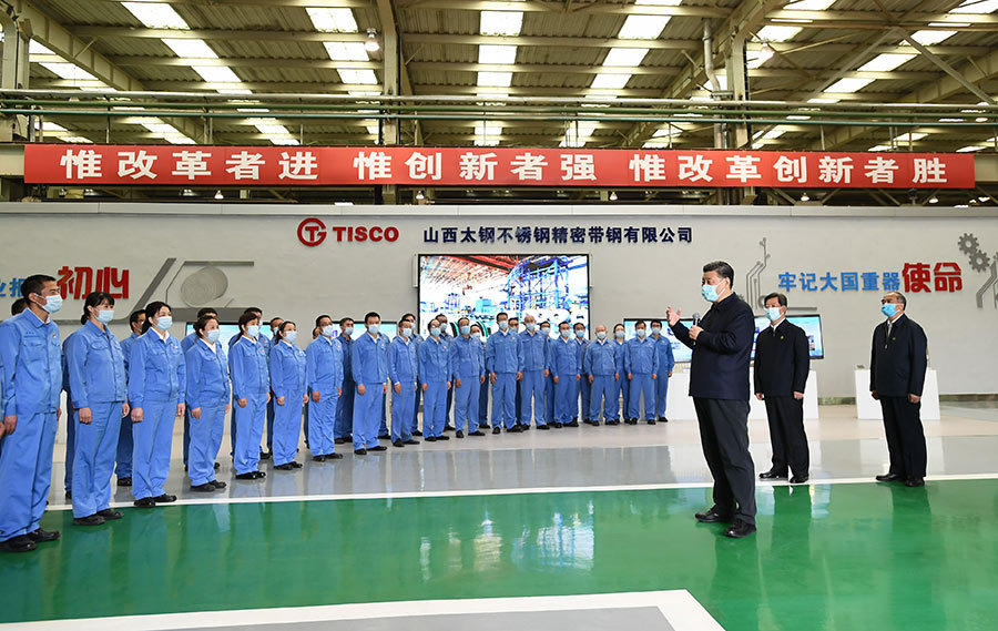 △2020年5月12日,習近平在山西太鋼不銹鋼精密帶鋼有限公司同企業(yè)職工親切交流。
