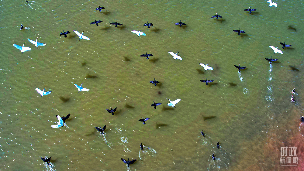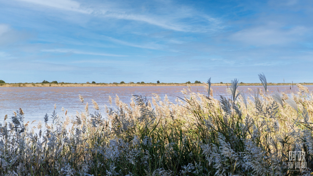 △當(dāng)天的黃河三角洲上,蘆花飄搖、候鳥成群。(總臺(tái)央視記者彭漢明、國廣記者李晉拍攝)