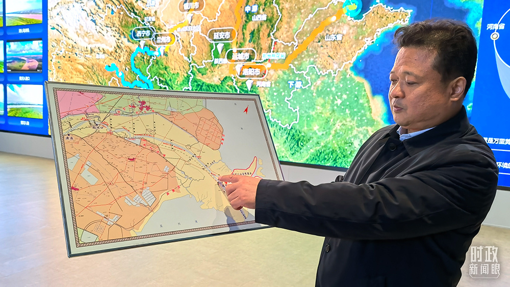 △黃河河口管理局局長裴明勝正在介紹黃河三角洲的防洪設(shè)施建設(shè)。(總臺(tái)央視記者韓銳拍攝)