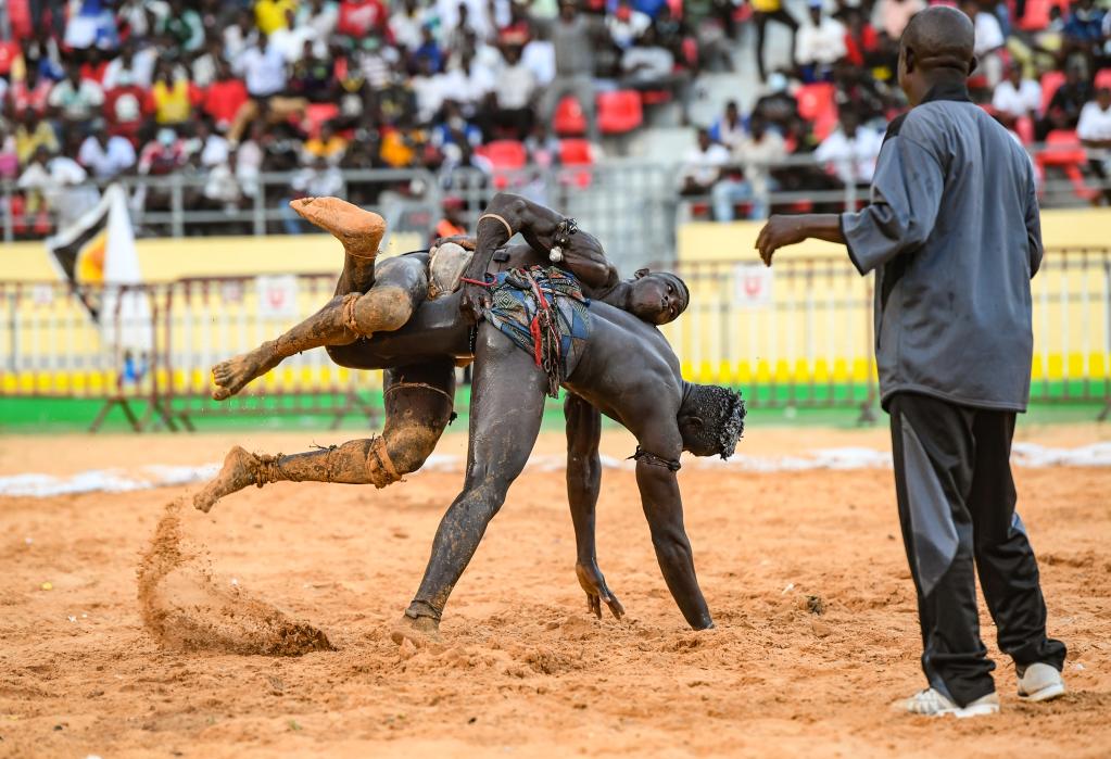 11月21日,在塞內加爾首都達喀爾,選手在塞內加爾競技摔跤場內比賽。