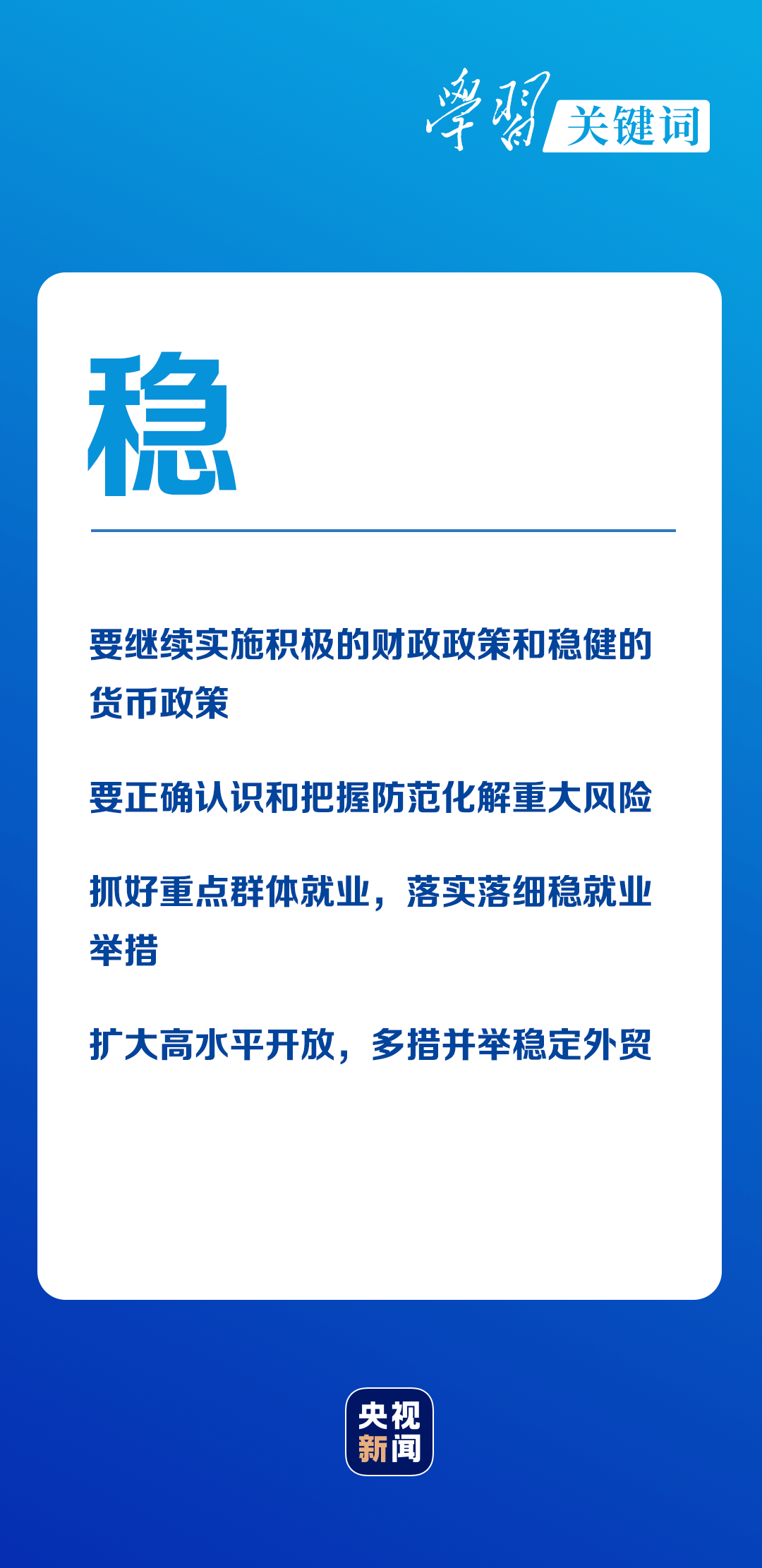 “穩(wěn)”的重點是放在穩(wěn)住經濟運行上——穩(wěn)就業(yè)、穩(wěn)金融、穩(wěn)外貿、穩(wěn)外資,從而提振市場信心,保持經濟持續(xù)健康發(fā)展和社會大局穩(wěn)定,增強人民群眾獲得感、幸福感、安全感。