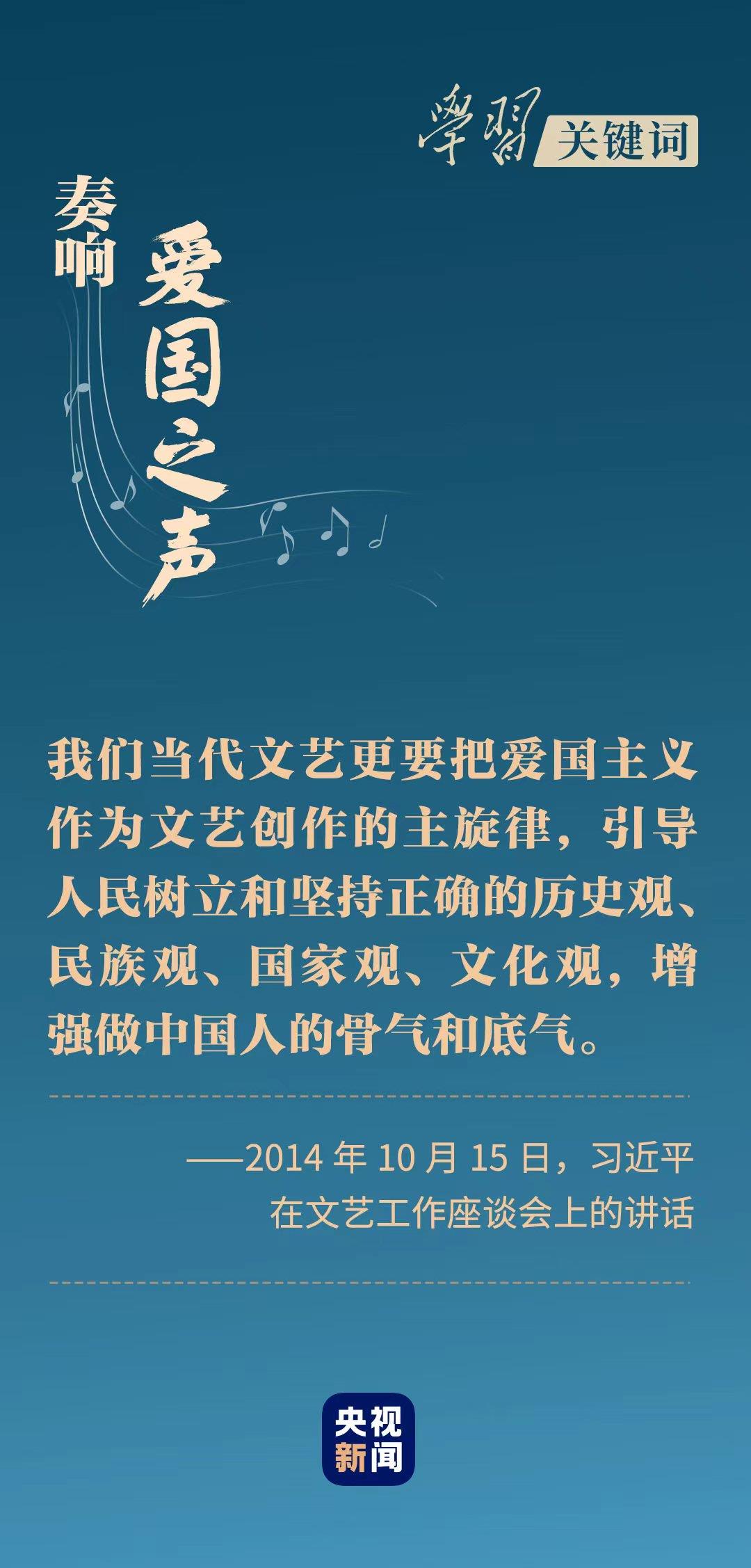 “我們要高揚(yáng)愛國(guó)主義主旋律,用生動(dòng)的文學(xué)語(yǔ)言和光彩奪目的藝術(shù)形象,裝點(diǎn)祖國(guó)的秀美河山,描繪中華民族的卓越風(fēng)華,激發(fā)每一個(gè)中國(guó)人的民族自豪感和國(guó)家榮譽(yù)感。”