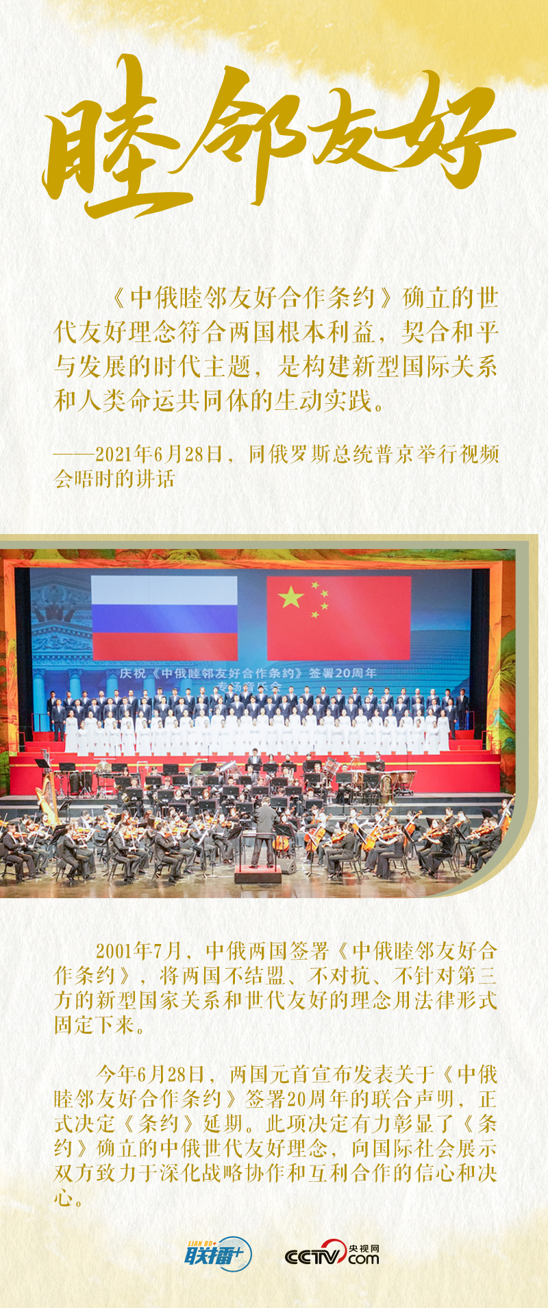 值此中俄“背靠背”戰(zhàn)略協(xié)作和全方位務實合作蓬勃發(fā)展之際,央視網(wǎng)《聯(lián)播+》特梳理習近平主席關(guān)于中俄關(guān)系發(fā)展的重要論述,與您一起學習。