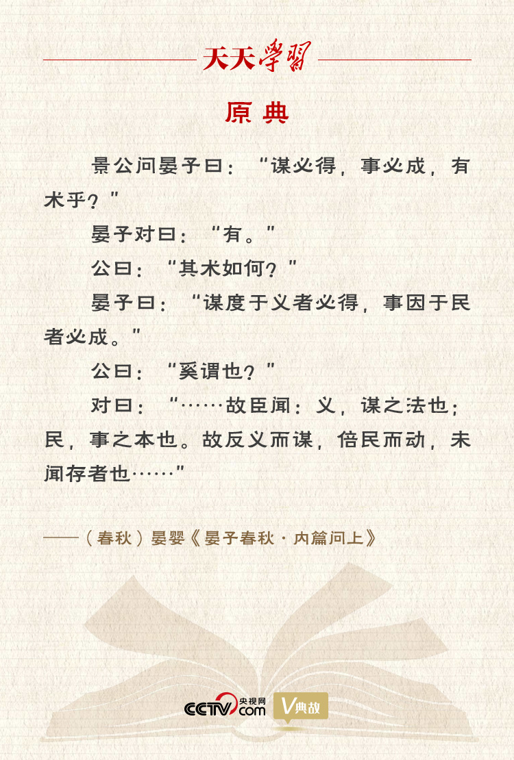 “謀度于義者必得,事因于民者必成”出自《晏子春秋》,意思是謀劃時考慮符合道義的就一定能夠?qū)崿F(xiàn),做事時注重順從民意的就一定能夠成功。