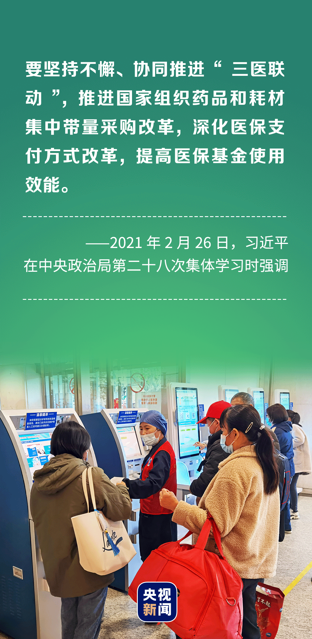 總書記勉勵道,“要繼續(xù)深化醫(yī)藥衛(wèi)生體制改革,均衡布局優(yōu)質(zhì)醫(yī)療資源,改善基層基礎(chǔ)設(shè)施條件,為人民健康提供可靠保障。”