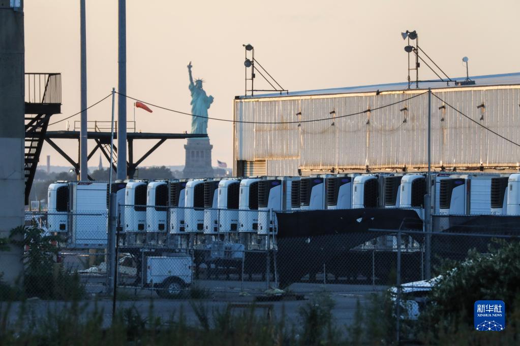 這是在美國紐約布魯克林拍攝的一處臨時(shí)停尸場(chǎng)內(nèi)存放新冠患者遺體的冷藏車(2021年9月6日攝)。新華社記者 王迎 攝